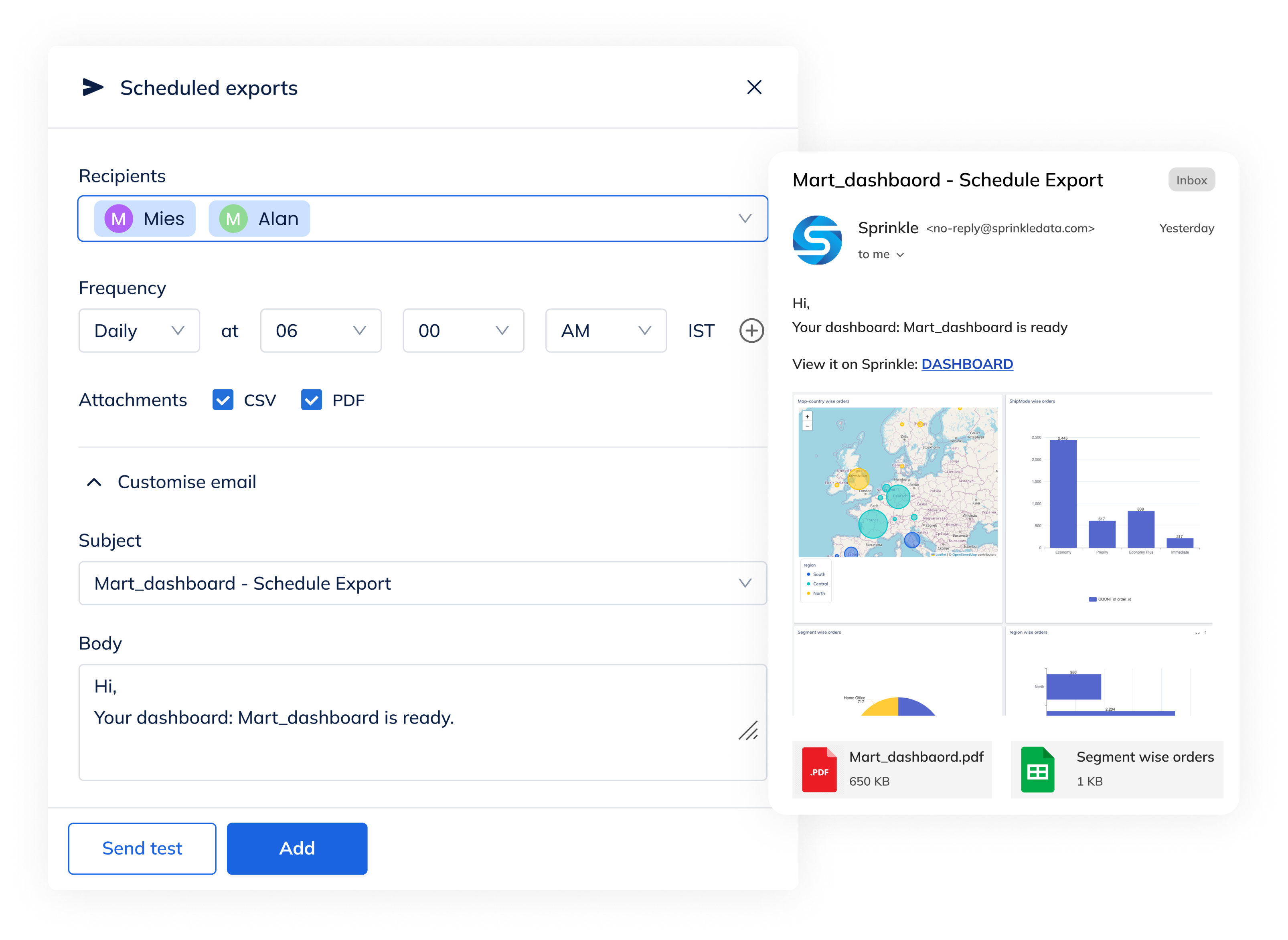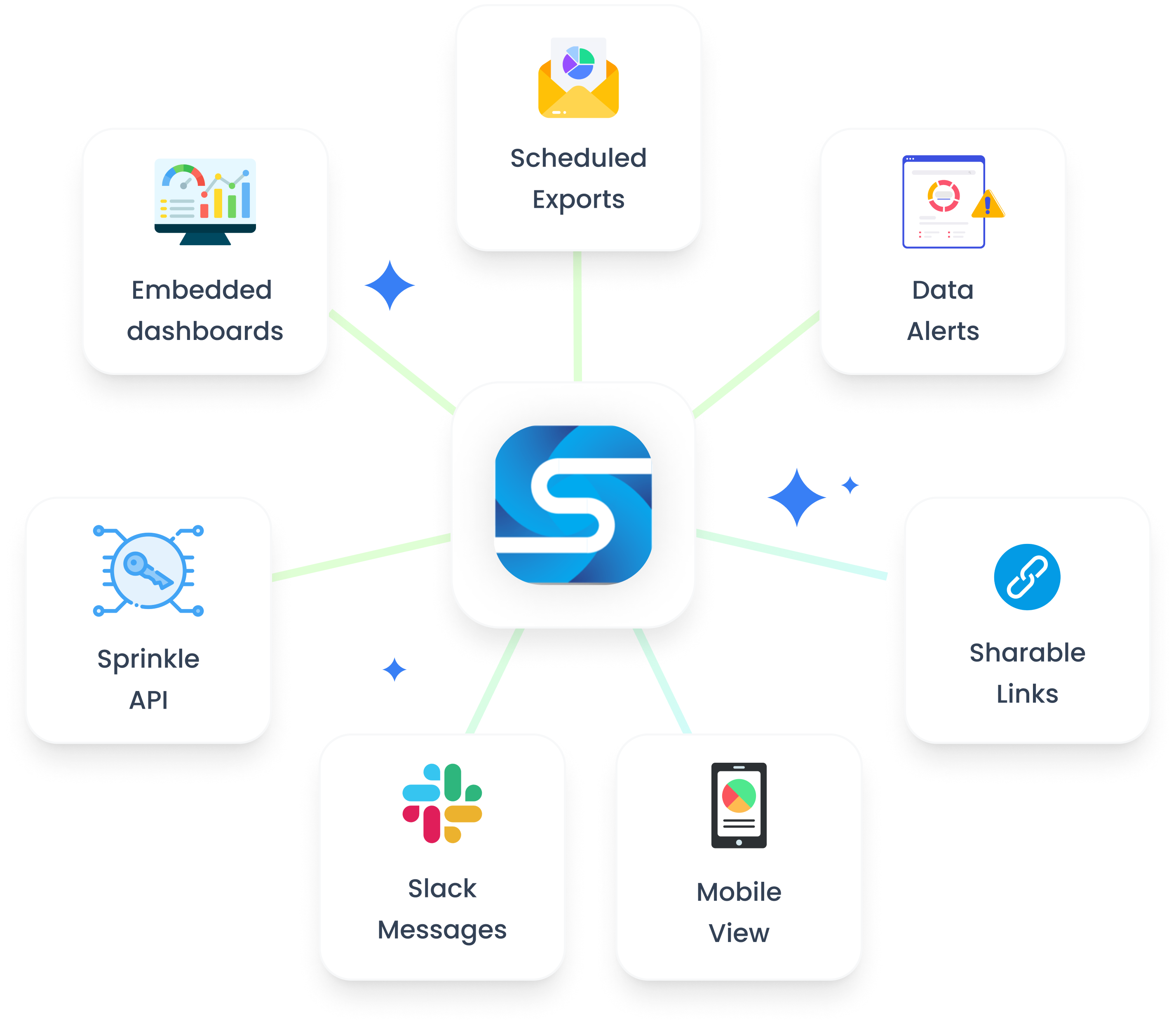 Sprinkle allows you to deliver your data as CSV & PDF directly via email & slack. Additionally, you can use Sprinkle APIs allowing you to programmatically access and integrate data delivery features into custom workflows or applications..